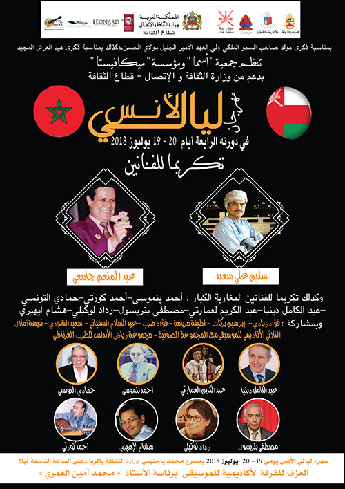 Le Festival Layali Al ouns dans sa quatrième édition rendant hommage au Grand Chanteur marocain « ABDELMOINIM AL JAMAII » et Feu le grand chanteur de SOLTANAT OMMANE « SALIM ALI SAID » au théatre « Mohammed bahnini »du Ministére de la culture à Rabat à 21h00 avec la participation de chanteurs et chanteuses confirmés.